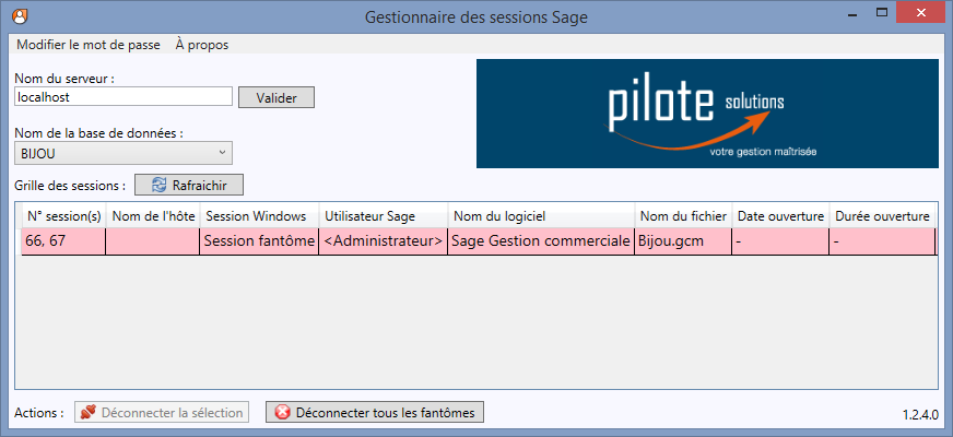 Cet outil permet de déconnecter les utilisateurs Sage de la Gestion commerciale ou la Comptabilité. Il offre également la possibilité de supprimer les “sessions fantômes”, ces comptes considérés comme toujours connectés au programme Sage.