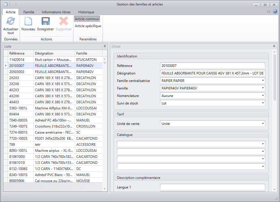 Le programme s’ouvre depuis la Gestion commerciale et permet de créer, modifier ou supprimer des articles et familles sur toutes les entités en simultané. Il est possible également de créer des articles ou familles spécifiques qui seront visibles uniquement par l’entité qui exécute le programme.