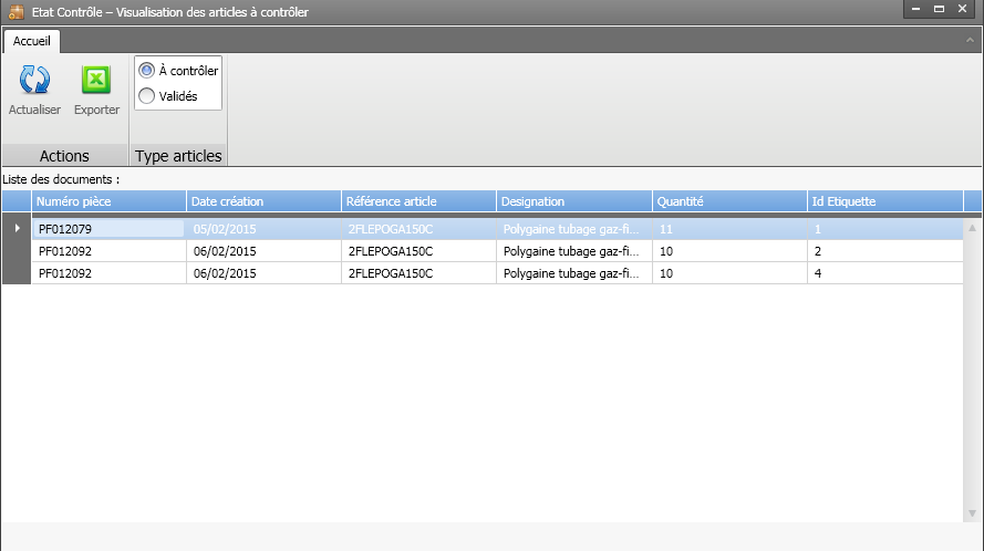 Le programme “Etat contrôle” permet de visualiser l’ensemble des lignes articles qui sont marquées “à contrôler” et celles qui ont été contrôlées avec leur commentaire de validation. L’affichage des lignes articles se présente sous forme de grille avec les informations du document d’origine, celles de l’article, la quantité de la ligne et l’identifiant unique de l’étiquette produit. La liste des lignes articles peut être exportée au format CSV pour être consultée et manipulée dans Excel.