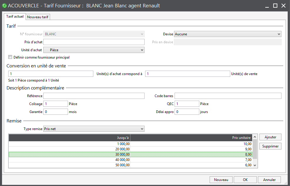 Ce programme permet de mettre à jour les tarifs fournisseurs de plusieurs articles simultanément. Les bornes de remise peuvent être saisies à la main ou chargées à partir d’un fichier (CSV ou Texte).