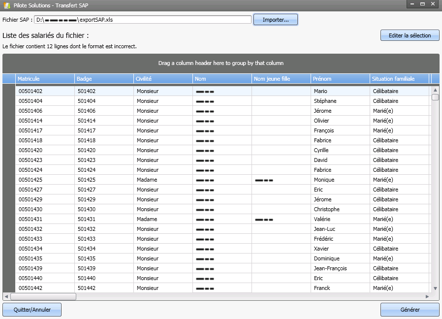 Les données SAP sont lues à partir d’un fichier Excel et affichées dans une grille. Chaque ligne représente un salarié et sa situation qu’il est possible d’éditer. Les données peuvent être intégrées dans la Paie Sage à partir d’un fichier Excel généré par le programme.