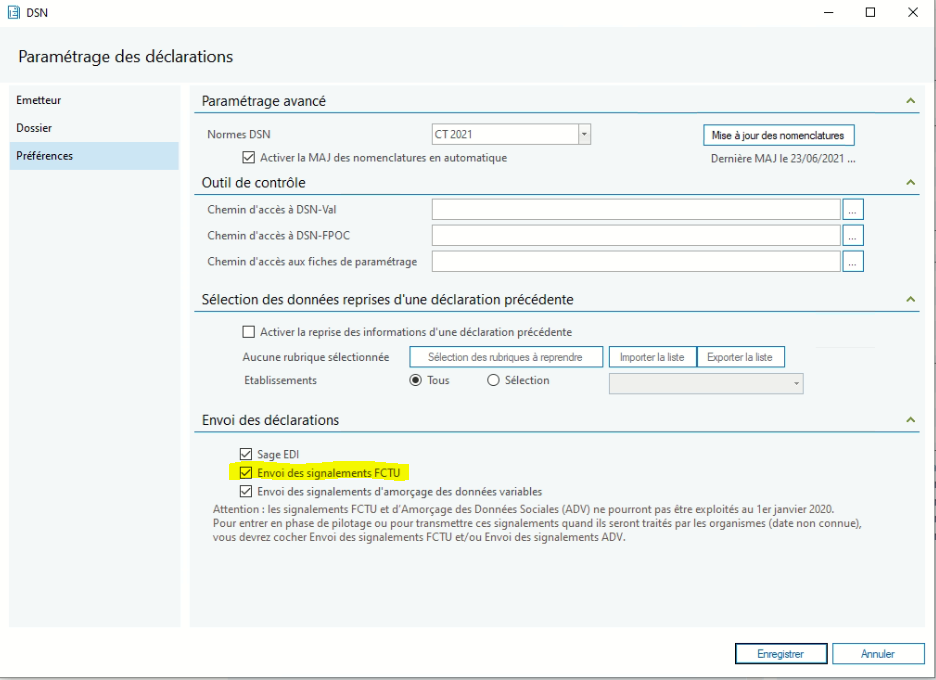 Afin de pouvoir générer un signalement FCTU depuis votre logiciel de paie, vous devez au préalable cocher Envoi des signalements FCTU dans le paramétrage des déclarations.